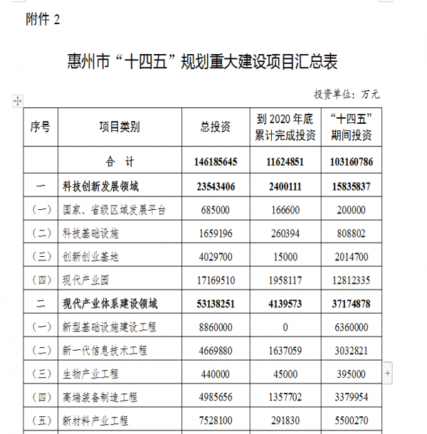 6月3日,惠州市政府正式對外公布《惠州市國民經濟和社會發展第十四個五年規劃和2035年遠景目標綱要》(下稱《綱要》)。其中明確提出,“十四五”期間規劃建設重大項目312宗,計劃總投資近1.5萬億元,“十四五”期間計劃投資10316億元。